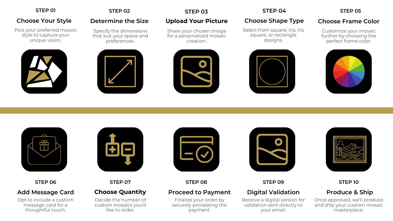 Every mosaic we create is a labor of love, designed to celebrate your most cherished moments. Meticulously crafted with passion and precision, each piece is a unique expression of your love story—turning memories into timeless works of art.